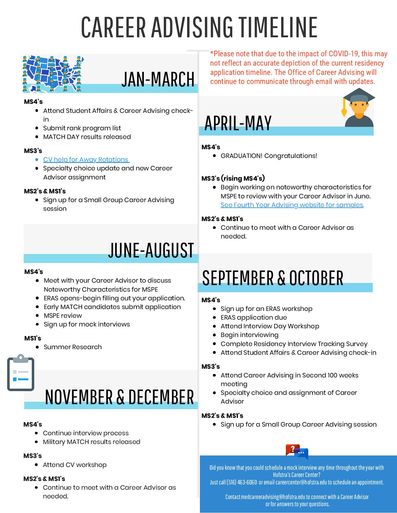 The Office of Career Advising supports a longitudinal advising process, which is modeled after the resources from the AAMC’s Careers in Medicine Program. Career Advising sessions take place in the form of small group session, larger class meetings and individual meetings between students and advisors.
