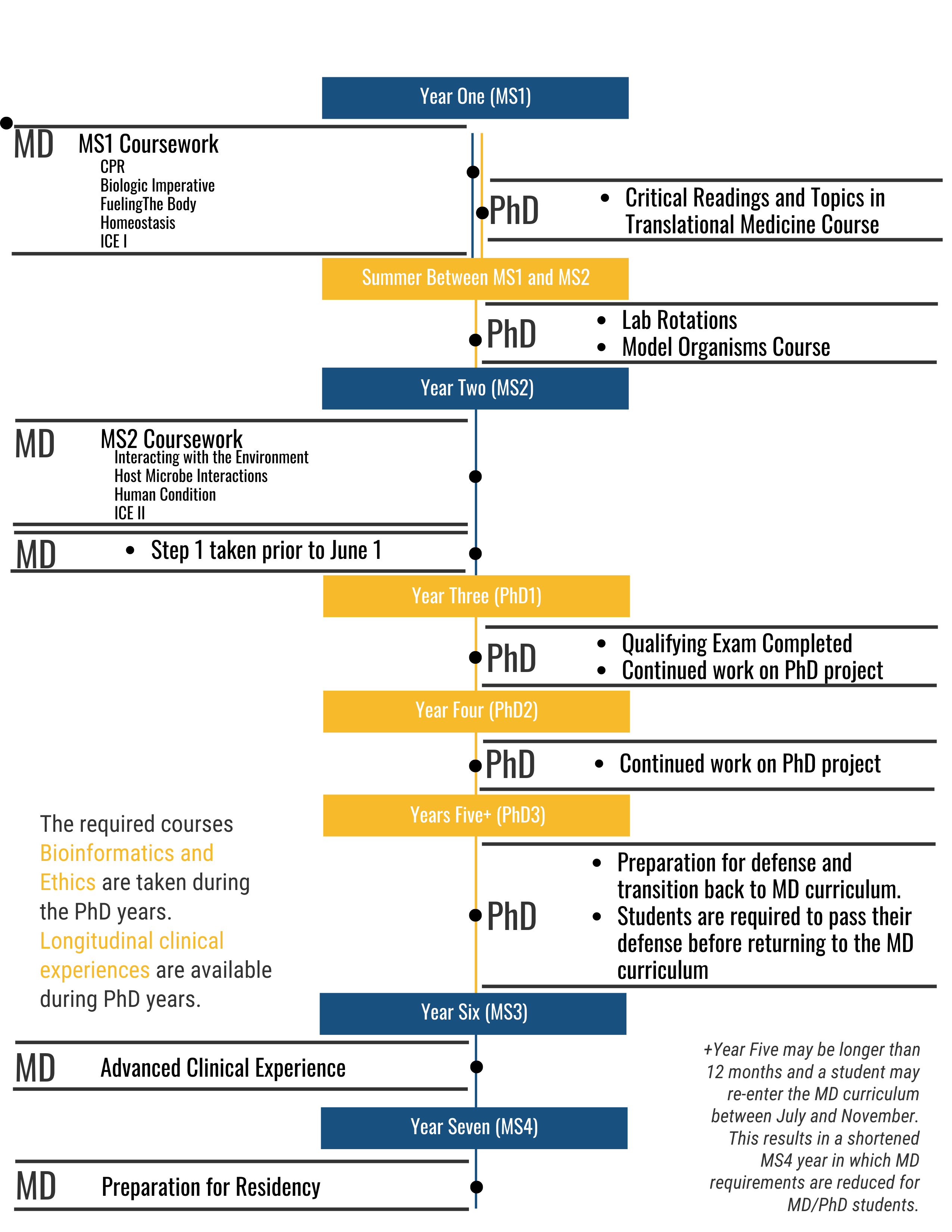 Students in the MD/PhD program receive their PhD degree in The Molecular Basis of Medicine. The goal of this program is to train individuals to pursue scholarly activity in biomedical, translational and clinical research with the goal of transforming and improving medical care for the population. The unique aspects of this program are the emphasis on the study of human disease and on application of that study to clinical practice.